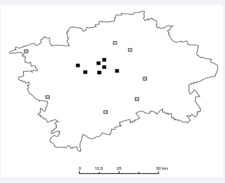 Figure 1: Locations of the air quality monitoring stations in Prague used in this study. Black square: monitoring station in the central part of the city Grey square: monitoring station in the peripheral part of the city Black line: city boundary
