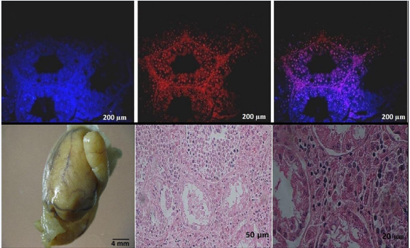 Flow cytometry analysis revealed that the average expression of PLZF in SCs was 45.6 ± 5.7% at the conclusion of the first week of culture, escalating to 84.7 ± 4.02% by the end of the second week. Additionally, the expression of specific markers associated with SCs, including 4 Oct- GFRa, PLZF, VASA, Igα6, Igβ1, along with GAPDH as a housekeeping gene, was assessed. To probe the functionality of SCs, these cells were transplanted into the testes of azoospermic mice after being labeled with DiI and DAPI. Direct injection of 105 cells into the efferent ducts of azoospermic mice facilitated transplantation. After an 8-week period post-transplantation, tissue sections were meticulously prepared and examined under a fluorescent microscope. Confirmation of EL-4 cells was achieved through H-2Kb monoclonal antibody staining, revealing a specific expression of the H-2Kb marker on the surface of tumor cells, with an average expression of 96.25 ± 2.81%. Subsequently, to validate the tumorigenic potential of EL-4 cells, these cells were transplanted into the efferent ducts of the testes in azoospermic mice. Four weeks post- transplantation, the morphology and dimensions of the testicular tissue were evaluated. Histological analyses unveiled tumor formation in 70% of the mouse testicular tissue after 4 weeks, with an average tumor size measuring 142 mm (Figure 1).