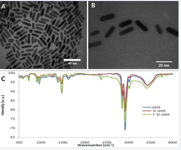The FTIR spectrum analysis depicted in Figure 2C showcases the transformation in spectral characteristics upon modifying silica-coated Gold Nanorods (GNRs) with folic acid. The incorporation of folic acid, consisting of p-aminobenzoic acid, glutamic acid, and heterobicyclic pteridine, led to discernible changes in vibrational bands. Notably, specific vibrational bands corresponding to the phenyl and pterin ring (PT) (around 11478 cm-1), as well as the OH of carboxylic acid of glutamic acid and NH group of pterin ring stretching within the range of 3500-3700 cm-1, underscored the absorption of folic acid molecules onto the gold nanorod matrix. Further elucidation of the morphology and dimensions of gold nanorods with silica coating (Figure 2A, B), was accomplished using electron microscopy. The histogram representing the size distribution of gold nanorods revealed a length of 20.43 ± 2.18 nm and a width of 5.55 ± 1.56 nm (Figure 2C).