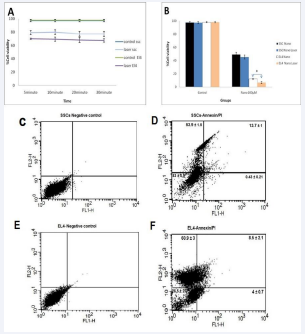 Figure 3 Assessment of Laser Irradiation and Gold Nanoparticle Dose. A: The graph illustrates the impact of varying laser irradiation durations on cell viability. B: MTT assay results depict the viability of EL4 tumor cells and SCs after 6 hours of incubation with different doses of gold nanoparticles followed by 5 minutes of laser irradiation. C, D: Flow cytometry data show the effects of laser therapy on SSCs, revealing changes in apoptosis and necrosis rates. E, F: Flow cytometry analysis demonstrates alterations in apoptosis and necrosis rates in EL4 tumor cells following laser therapy.