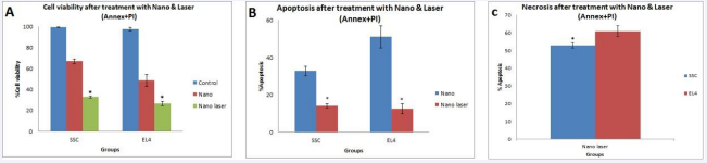 Figure 4 Comparative Analysis of SCs and EL4 Cells. A: The bar graph illustrates the survival rates of SCs and EL4 cells after incubation with gold nanoparticles and 5 minutes of laser irradiation. B: The graph shows the levels of apoptosis observed in SCs and EL4 cells following treatment with gold nanoparticles and laser irradiation. C: The bar graph depicts the extent of cell necrosis in SCs and EL4 cells after exposure to gold nanoparticles and laser irradiation for 5 minutes.