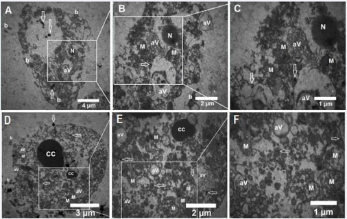 Prior to laser therapy, no necrotic SCs or EL4 cells were detected, highlighting a significant change in the necrosis rate post- laser therapy. Notably, the combination of F-Si-GNRs and laser treatment induced both apoptosis and necrosis in the cells, with necrosis being more prevalent than apoptosis (Figure 4A-C). Ultrastructural examination of EL4 cells post-laser treatment revealed aberrations such as an atypical nucleus, complete disruption of the cell membrane, mitochondria, and crystals, along with empty organelle bubbles protruding from the plasma membrane, indicative of necrosis (Figure 5A-F). Conversely, in SCs, distinct markers of apoptosis including chromatin condensation, plasma membrane bubbles containing cellular organelles, mitochondrial disruption, and phagocytic vacuoles were observed, underscoring the apoptotic pathway (Figure 5A-F). Notably, electron microscopic images post-laser irradiation revealed pronounced necrosis characterized by general cell swelling and accelerated loss of plasma membrane integrity compared to pre-treatment images. These comprehensive findings shed light on the intricate mechanisms underlying cell fate modulation in response to F-Si-GNRs and laser therapy, emphasizing the dual induction of apoptosis and necrosis as potential avenues for cancer treatment.