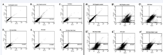 Figure 6 Flow Cytometry Analysis of EL4 and SCs. A-F: EL4 Cells, A´-F´: SCs, A, A´: Negative Control, B, B´: Positive Control, C, C´: Cells with Gold Nanoparticles, D, D´: Cells with Gold Nanoparticles Conjugated to Folate, E, E´: Cells with Laser Irradiation, F, F´: Cells with Gold Nanoparticles Conjugated to Folate and Laser Irradiation.