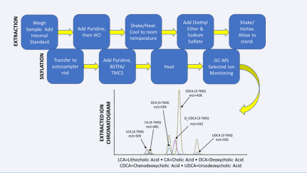Sample Preparation: We did not find another method that used acidified pyridine for extraction of bile acids from stool. Initially, it was found that stool did not disperse as well with pure pyridine as when some water was present. In this procedure, it was added as 200 µL concentrated hydrochloric acid (12 M aqueous). It was also found later that the bile acids would not derivatize without the addition of hydrochloric acid. We hypothesize that the carboxylic -OH of the bile acid molecule requires protonation in order to accept a TMS (trimethylsilyl group). With silylation, it was found that all water had to be removed or derivatization would not occur and split phases in the final derivatized extract would sometimes result, with no indication of the analytes. In addition to sodium sulfate, use of diethyl ether facilitated the removal of water from the organic extract, as well as resulted in a massive sample clean up: the pyridine/HCl solutions were dark brown to black before addition of diethyl ether and sodium sulfate. After these additions, and the requisite shaking/vortexing, sample extracts were clear, but not colorless. Standards were both clear and colorless.