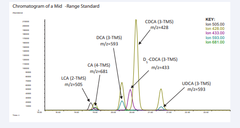 Instrument Conditions: Injection volume was 2 µL, with a split ratio of 10:1 using a 2.3 mm ID inlet liner (Thermo Scientific, #453A1285). Temperature parameters: Inlet temperature, 270°C; oven, 280°C; isothermal; transfer line, 320°C; Ion Source, 250°C; quadrupole temperature, 200°C. Mass Selective Detector was operated in selected ion monitoring (SIM) mode with a 100 ms dwell time. Electron multiplier voltage was about 2100 keV; tuning compound, PFTBA with m/z 502 tuned to 20% of m/z 69. Ions monitored: LCA, m/z M-15=505 (loss of -CH3 ); DCA m/z M-15=593 (loss of -CH3 ); UDCA, m/z M-15=593 (loss of -CH3 ); CDCA, m/z M-180=428 (loss of two TMS-OH); CA, m/z M-15=681 (loss of -CH3 ); D5 -CDCA, m/z M-180 (loss of two TMS-OH); Wash A and B, pre- and post-injection, 2x and 2x, respectively, with acetonitrile; preinjection sample wash,1x.