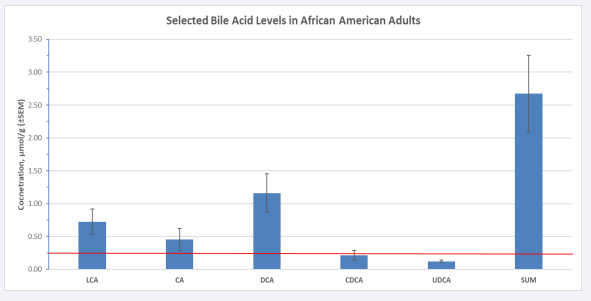 Figure 2: Analysis of targeted bile acids in the stool of healthy African American adults. Results are in µmol/g and the red line indicates the lower limit of quantitation, 0.25 µmol/g. Results below 0.25 µmol/g were extrapolated before averaging.