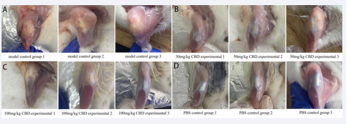 Significant swelling and hyperemia could be seen around the bone tissue of rats in model control group, but there was no obvious swelling of knee joint in PBS control group, 50 mg/kg CBD and 100 mg/kg CBD experimental groups. It is suggested that CBD can alleviate the pathological changes of OA induced by intra-articular injection of sodium iodoacetate.