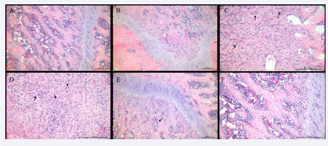 While, significant fibrous tissue hyperplasia was seen around the bone tissue of rats in the model control group, and inflammatory cells were mixed in it; The quantity and size of chondrocytes are decreased, the chondrocyte partition is destroyed, sodium iodoacetate can substantially disrupt the structure of hyaline cartilage and damage its tissue structure, and the connective tissue totally replaces the cartilage surface [34]. The intramuscular administration of sodium iodoacetate solution has been shown to exacerbate pathological changes in OA (Figure 5D). 50mg/kg CBD has been suggested to alleviate these changes; fibrosis expression was reduced, the cartilage surface remained uniform, and the differentiation of chondrocyte partitions was partially preserved; however, local loss of cellular components on the surface and transition layer of the hyaline cartilage was still visible (Figure 5A). While 100 mg/kg of CBD can almost fully heal the pathological damage brought on by OA, no fibrosis was seen in the histological incision of the knee cartilage (Figure 5F) [34]. In the solvent group, fibrosis and inflammatory cells were evident around the bone tissue (Figure 5C).