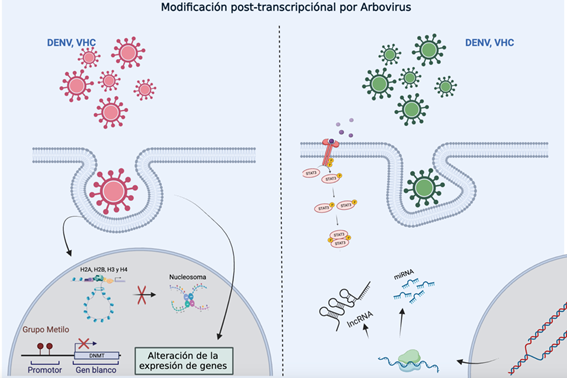 The human genome comprises all human genetic information, while the epigenome describes genome modifications that determine whether genes are turned on or off depending on location and need, without altering the DNA sequence itself. Unlike genetic information, the epigenome is dynamic and responsive to external stimuli. Some of these stimuli can cause abnormal DNA modifications that, in turn, may alter normal gene expression and contribute to the development of various pathologies [8-10]. There are several types of epigenetic modifications, such as DNA and RNA methylation, histone modifications (acetylation, methylation), nucleosome positioning, and silencing associated with non-coding RNA [8-10]. These well-characterized epigenetic mechanisms influence gene availability for activation or suppression, which in turn affects gene expression patterns and key cellular processes in the host [11]. In the last decade, epigenetic research has rapidly advanced in understanding developmental biology, memory, and heritability [12]. More recently, it has become increasingly relevant in studies on oncology, as well as adaptive and innate immunity [13]. Although epigenetics has evolved in other fields, it has received comparatively little attention in the study of infectious diseases and host–pathogen interactions. Nevertheless, there is strong evidence supporting the involvement of epigenetics in host defense against pathogens in biological interactions, including DNA and RNA methylation, histone modification, and non-coding RNA activity [14]. Regarding epigenetic modifications caused by viral infections, reports suggest that DNA viruses play a significant role in host methylation by epigenetically deregulating cellular pathways to optimize their own transcription, replication, or evasion of the host’s innate immune response [15]. Parallel studies have provided growing evidence supporting the hypothesis that RNA viruses such as influenza, coronaviruses, and some flaviviruses are capable of reprogramming the host’s epigenetic landscape and controlling the innate immune system [8,16,17]. This leads to regulated changes in host gene expression that generate a favorable environment for completing their life cycles, evading host immune responses, and establishing a latent state, thereby creating conditions for persistent infection [13]. In this context, arboviral infections are among the leading public health problems worldwide. In particular, viruses from the Flaviviridae and Togaviridae families are generally pathogenic, often acute, and cause population-level viremia, representing a significant medical and economic burden for healthcare systems in endemic regions [4]. De Aguilar G et al., explains, “To date, some studies of epigenetic markers have investigated a series of epigenetic modifications, particularly miRNA/siRNA, iRNA suppression, modifications of iRNA regulators, and DNA methylation, in relation to host responses to arbovirus infections—mainly Dengue, Zika, Japanese encephalitis, Chikungunya, West Nile, and Crimean-Congo”[18].
