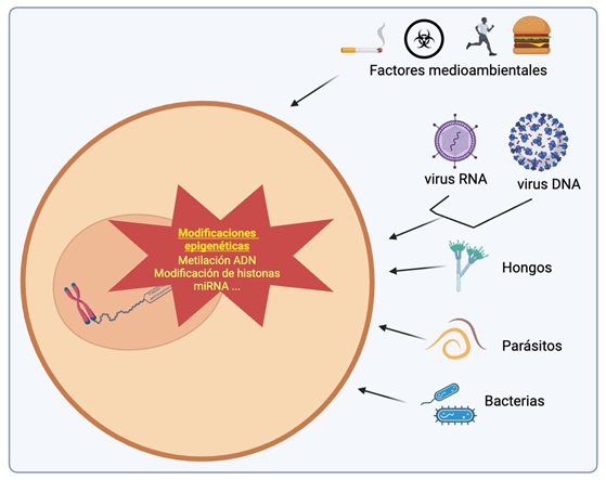 Figure 2: Schematic representation of the influence of various pathogens on epigenetic mechanisms. A wide range of pathogens—including viruses, bacteria, parasites, and fungi—can alter the host’s epigenetic mechanisms to promote their replication, persistence, or evasion of the immune system. These epigenetic modifications include DNA methylation, histone modifications (such as acetylation, methylation, and phosphorylation), and changes in the expression of non-coding RNAs such as miRNAs and lncRNAs. Such alterations can suppress genes involved in immune responses or activate genes that facilitate infection, thereby regulating gene expression without altering the underlying DNA sequence.