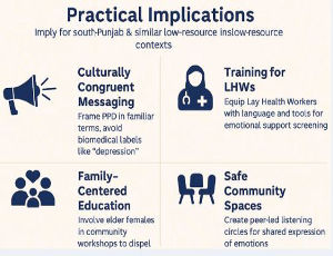 Based on the study’s findings, the following recommendations are proposed: Integrate Maternal Mental Health in Primary Care embed mental health screening within maternal and child health visits at Basic Health Units (BHUs), using culturally adapted tools. LHWs Mental Health Training provide Lady Health Workers with short, practical training on recognizing emotional distress and offering basic psychosocial support. Development of culturally sensitive communication materials e.g. audio visual resources in Saraiki and Urdu to raise awareness about PPD, utilizing metaphors and idioms women relate to. Community-based peer support establishment at village-level listening spaces or women’s circles led by trained peer facilitators where emotional sharing is normalized. Family engagement programs focused on intergenerational education sessions targeting mothers-in law and spouses to encourage empathy and reduce stigma.