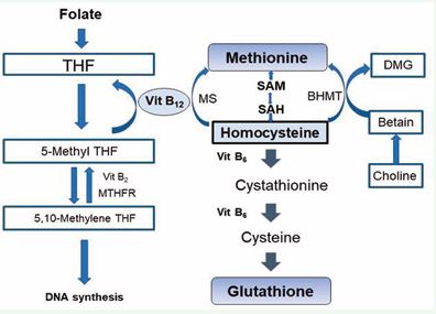 Figure 1 Mechanisms linking Vitamin?B12 deficiency to cognitive decline. Folate (vitamin B9) is converted to Tetrahydrofolate (THF) and subsequently to 5,10-methylene THF via MTHFR and vitamin B2-dependent reactions. 5-methyl THF donates a methyl group to homocysteine, a reaction catalyzed by methionine synthase (MS) with vitamin B12 as a cofactor, regenerating methionine. Methionine is converted to S-adenosylmethionine (SAM), the universal methyl donor, which cycles to S-adenosylhomocysteine (SAH) and back to homocysteine. Homocysteine can also be remethylated via betaine homocysteine methyltransferase (BHMT) using choline-derived betaine or converted to cystathionine and cysteine through the vitamin B6-dependent transsulfuration pathway, ultimately forming glutathione. Disruptions in these pathways due to B12, folate, or B6 deficiency result in elevated homocysteine, impaired methylation, reduced DNA synthesis, oxidative stress, and increased risk for vascular and neurocognitive disorders.