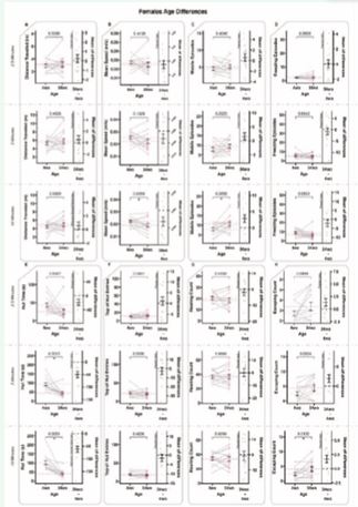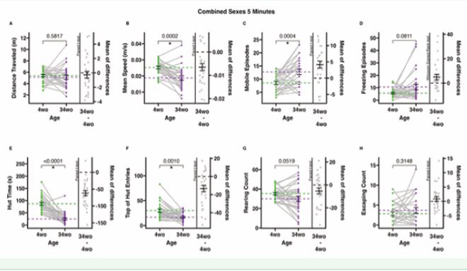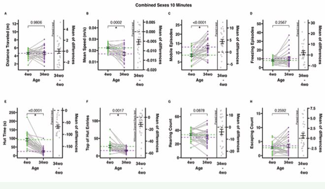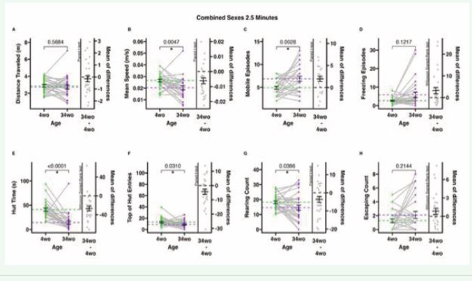 Figure 3 2.5-minute-long ANY-mazeTM overhead video monitoring of male and female mice at 4 and 34 weeks old. Dots represent individual animals (n=28); grey lines connect individual animals from the first to the second time point; dotted lines represent means, and error bars represent standard error (SE). The mean of difference is calculated on the right-hand side of the graphs, with a dotted line at 0, a solid line at the mean, and SE error bars. A. The total distance (meters) the animals traveled during the test. B. The mean speed (meters/second) of the animals only during mobile time (adjusted mean speed). C. Mobile episodes count the number of times the animals start moving from an immobile or freezing episode. D. Freezing episodes count the number of times the animals suppress all movement. E. Hut time (seconds) measures how long animals spend in their residential security hut (the security hut blocks the camera view, and all hut time is excluded from all other measures). F. Top of hut entries count the number of times animals climb on top of the security hut. G. Rearing counts the number of times the animals rear. H. Escaping counts the number of times the animals attempted to climb out of the testing cage (during this behavior, animals were gently alerted with a noise to provoke a return to the cage).
