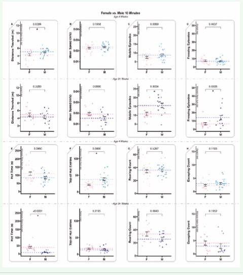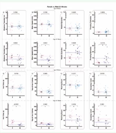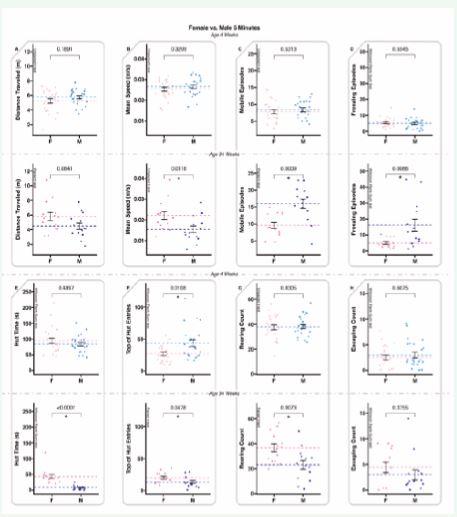Figure 5 5-minute-long ANY-mazeTM ?overhead video monitoring of 4-week-old and 34-week-old animals examining differences between sexes. 4-week-old animals are displayed before 34-week-old animals; dots represent individual animals (n=28); dotted lines represent means, and error bars represent standard error (SE). A. The total distance (meters) the animals traveled during the test. B. The mean speed (meters/second) of the animals only during mobile time (adjusted mean speed). C. Mobile episodes count the number of times the animals start moving from an immobile or freezing episode. D. Freezing episodes count the number of times the animals suppress all movement. E. Hut time (seconds) measures how long animals spend in their residential security hut (the security hut blocks the camera view, and all hut time is excluded from all other measures). F. Top of hut entries count the number of times animals climb on top of the security hut. G. Rearing counts the number of times the animals rear. H. Escaping counts the number of times the animals attempted to climb out of the testing cage (during this behavior, animals were gently alerted with a noise to provoke a return to the cage).