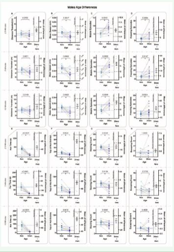 Figure 8 ANY-mazeTM overhead video monitoring of the differences between 4 and 34-week-old male animals in 2.5, 5, & 10-minute-long tests. Dots represent individual animals (n=14); grey lines connect individual animals from the first to the second time point; dotted lines represent means, and error bars represent standard error (SE). The mean of difference is calculated on the right-hand side of the graphs, with a dotted line at 0, a solid line at the mean, and SE error bars. A. The total distance (meters) the animals traveled during the test. B. The mean speed (meters/second) of the animals only during mobile time (adjusted mean speed). C. Mobile episodes count the number of times the animals start moving from an immobile or freezing episode. D. Freezing episodes count the number of times the animals suppress all movement. E. Hut time (seconds) measures how long animals spend in their residential security hut (the security hut blocks the camera view, and all hut time is excluded from all other measures). F. Top of hut entries count the number of times animals climb on top of the security hut. G. Rearing counts the number of times the animals rear. H. Escaping counts the number of times the animals attempted to climb out of the testing cage (during this behavior, animals were gently alerted with a noise to provoke a return to the cage).