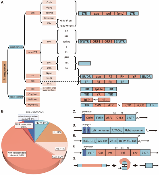 There are many different classification systems, but no worldwide standard committee was formed based on those put forward by Finnegan proposal [3], to Repbase proposal [4,5] and Wicker proposal [6], and finally to Curcio and Derbyshire proposal [7]. Of all the classification systems proposed thus far for transposable elements, the ones most commonly used are those presented by Repbase and Wicker. The systems proposed by these two research groups will be explained in detail below. Based on their mechanisms of transposition, TEs have been classified as class I elements (retrotransposons) and class II elements (DNA transposons) [8]. These two classes can be further subdivided into multiple subclasses, (or orders [6]), primarily distinguished by their replication and chromosomal integration mechanisms, and then into superfamilies and families, which are more accurately characterized on the basis of phylogenetic relationships [9] (Figure 1A). Briefly, most class II transposable elements, although not all, mobilize through a “cut-and-paste” mechanism, whereby the transposon itself is excised and moved to a new genomic location [10]. Thus, in contrast to retrotransposons, these elements typically do not accumulate in copy number. Instead, they adopt strategies of either transposing from replicated to unreplicated sites during host DNA synthesis or utilizing the error-prone homologous recombination repair to elevate their copy number [1]. This usually causes internal deletions in transposons [11] (nonautonomous elements lacking the coding capability but carrying transposase binding site for autonomous element proliferation at cost), and the progeny are thus highly possibly to form large families of MITEs (miniature inverted-repeat TE) [12]. DNA Transposons can be divided into TIRs (Terminal Inverted Repeats), Cryptons, Helitrons and Mavericks (also known as Polintons). TIRs are distinguished by the presence of terminal inverted repeats and are responsible for encoding a transposase (DDE transposases, named after the catalytic residues of aspartic acid and glutamic acid [13]) that mediates excision and integration by binding to TIRs. The precise mechanism by which DDE transposase transposes varies from superfamily to superfamily, but in the case of all members of the eukaryotic organisms studied thus far, the process commences with a nucleophilic attack of a water molecule close to the ends of each TIR, eventually resulting in direct excision and subsequent relocation of the transposon DNA [14]. DDE transposons represent the most diverse and extensively distributed category of TEs, comprising at least 17 large superfamilies that are characterized by phylogenetically distinct transposases [15]. Cryptons share similar characteristics with DDE transposons, consisting of a single open reading frame (ORF) that produces tyrosine recombinase (YR) rather than DDE transposases enclosed within short terminal inverted repeats (TIRs). Helitrons are mainly non-autonomous elements lack TIRs but encode large Rep/Hel proteins, which feature DNA helicase domains fused with HUH nuclease domains [16]. They replicate by means of a“peel-and-paste”mechanism that leads to the formation of a covalently closed circular double-stranded DNA intermediate during rolling of the circle towards the 3’end of the Helitron while separating its sense strand and, possibly, synthesizing the other strand [17]. Mavericks are substantial DNA transposons that encode up to twenty protein-coding genes, which are flanked by long TIRs [18]. Maverick/Polintons exhibit similarities with various groups of double-stranded DNA (dsDNA) viruses. These include a protein-primed family-B DNA polymerase (pPolB) that is most similar to that of adenovirus, suggesting that they replicate by directly synthesizing copies of DNA (hence the term “self-synthesizing transposons”[19] ). They also encode a DDE nuclease that is most closely related to retroviral INs, which aligns with the fact that they generate 5- or 6-base pair target site replication during the process of chromosomal integration [19]. It is possible that numerous Maverick and Polinton elements could be encoded for double as well as single jelly-roll cap-like protein domains, leading people to think they may represent potential endogenous viruses or virophages [20]. Since DNA transposons have been inactive for so long that they became inactive by truncation and mutation [21] and retrotransposons outnumber DNA transposons 13 to 1 in the human genome [22], we will limit our attention below to retrotransposons only. Unlike class II elements, which go through a process of replication using RNA as an intermediary?class I elements go through the following steps after they are replicated: the RNA is then reversed transcribed into DNA; the newly formed DNA copy replaces the original template element, thus named“copy-and-paste”elements. Because the original template element remains intact, these retrotransposons (RTPs) are also called “copy-and-paste” elements [10]. Retrotransposons were later classified into four subclasses based on the structure and the mechanism they used for their own replication: long terminal repeat (LTR), non-LTR, tyrosine recombinase (YR)-mobilized and Penelope-like elements (PLEs) [1]. LTR elements are distinguished by the presence of 5’ and 3’ non-coding long terminal repeats that regulate the expression of “retroviral genes”, reflecting their evolutionary connection to retroviruses. Autonomous LTR elements typically encompass a minimal collection of two distinct genes, namely gag and pol, which are generally expressed as a single polycistronic RNA transcribed from a Pol II promoter situated within the LTR itself. Both gag and pol genes code for polyproteins, which are further divided into different proteins via protease (PR) produced from the pol gene. Besides, the Pol gene codes important enzymes like reverse transcriptase (RT), RNase H and inte