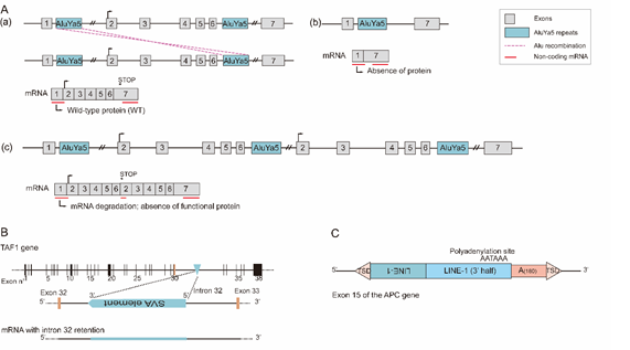 Also transposable element insertions often cause aberrant alternative splicing events (Figure 5B) like exon skipping or intron retention. This disrupts the patterns of the mRNA splicing leading to dysregulated gene expression which has a pathological consequence. One striking example of this phenomenon is illustrated in Figure 5B, where an SVA retrotransposon insertion within intron 32 of the TAF1 (TATA box-binding protein-associated factor 1) gene disrupts the correct splicing of the mRNA leading to intron retention in mature RNA and thereby promoting a deleterious mutation by producing a long aberrant RNA molecule. This molecular defect was associated with X-linked dystonia-parkinsonism (XDP), a disorder which causes movement disorders and is highly prevalent among Filipino population [137]. Figure 5C tells another critical mechanism that ectopic polyadenylation signals such as a canonical polyadenylation signal (AATAAA) appear naturally in LINE-1, and are quite common on the A-rich tails of SINE elements, including HERV LTRs that bear endogenous polyadenylation signals. They can be interposed into an internal region of a gene, thereby creating a novel intragenic polyadenylation site. This site may prompt premature termination during transcription that initiates downstream gene truncation to form a shortened mRNA isoform. Such shortening will, without doubt, cause the loss of crucial exon regions and would thus be expected to result in a nonfunctional protein product. Importantly, this phenomenon where altered polyadenylation sites arise from these RNA elements appears to be a hallmark of various human genetic diseases.