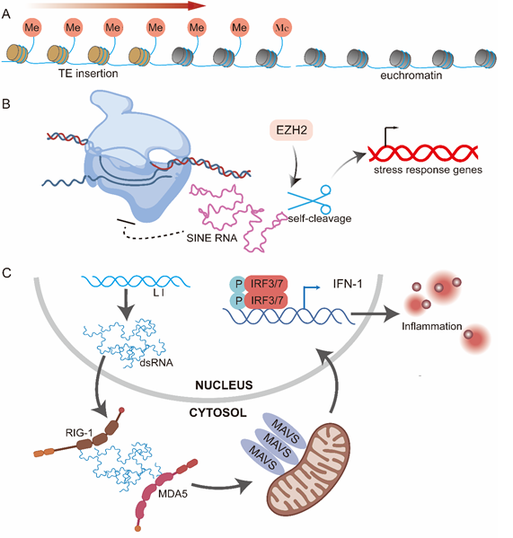 TEs bring great benefits to cellular systems, including mediating the regulation of gene expression and accelerating evolution under environmental stress; however, during this process, transposition may be detrimental and induce such situations as DNA damage and activation of cGAS-Sting signaling pathways, which may cause the occurrence of inflammatory responses. Cells thus need to establish their own regulatory mechanisms to maintain a delicate equilibrium between the expression and repression of TEs [155]. The intracellular regulatory network for the TE's transcription is highly complicated, which involves not only at the epigenetic level but also comprises post-transcriptional, translational, and nuclear importing of the corresponding RNA molecules. However, an imbalance in TE repression often occurs during aging or other processes, resulting in TE activation and subsequent DNA damage. Understanding regulation algorithms will help in controlling DNA damage and solving aspects of the aging mechanism. Hence, it is necessary to describe all the essential regulatory modes in detail so that imbalance mechanisms due to the decrease or increase of some genes can be figured out.