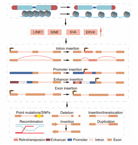 The insertion of retrotransposons in proximity to genes can also significantly interfere with gene expression, which potentially result in to the activation of oncogenes such as Ostf1 and Ret [138]. When such insertions occur within a gene's coding region, they may result in frameshift mutations and premature termination codons, which ultimately lead to a loss of gene functionality. Furthermore, retrotransposon insertions located within introns can facilitate alternative splicing processes of the associated genes [139,140]. For example, Alu and LINE-1 can induce alternative splicing to alter transcript integrity [140,141]. When TEs get inserted into DNA repair genes such as breast cancer type 2 susceptibility protein (BRCA2) [142], tumor suppressor genes like adenomatous polyposis coli protein (APC) [143], or retinoblastoma protein 1 (RB1) [144], the genome stability will be disrupted or tumorigenesis will occur respectively. Retrotransposons also have the capability to induce structural variation in the form of inversions, deletions, insertions, or amplifications [145]. By recruiting epigenetic modifiers and subsequently altering chromatin accessibility, retrotransposons also could influence neighbouring gene expression [146]. Chromosome end shortening triggers chromatin opening leading to the activation of LINE1 retrotransposons and other active elements. For example, LINE1 elements can act as alternative promoters (intronic insertions), donators of splice sites (intronic insertions), or alternative enhancers/elongation factors (enhancer insertions) in genes. As a result of these insertions, point mutations/SNPs, deletions, insertions/translocations, recombination events, inversions, and duplications could happen.