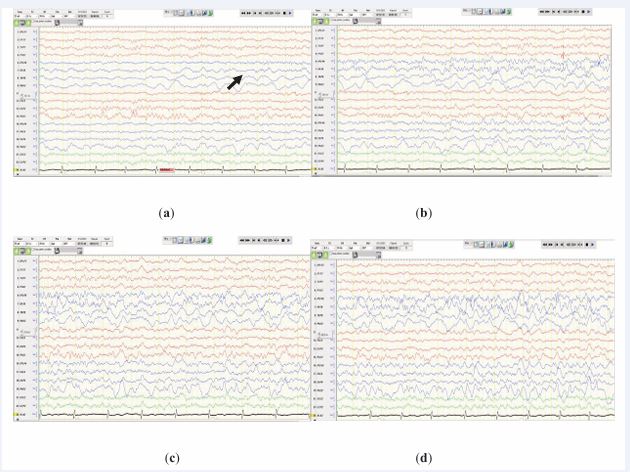 Figure 1 Electrographic recording of a seizure captured during sleep (sleep spindle and vertex wave are visualized in the 7 and 8 s of the epoch) on a longitudinal bipolar montage. A 10-Hz alpha frequency, maximized at F8, is observed at onset. (a), (b), (c), and (d) represent the evolution of the seizure.