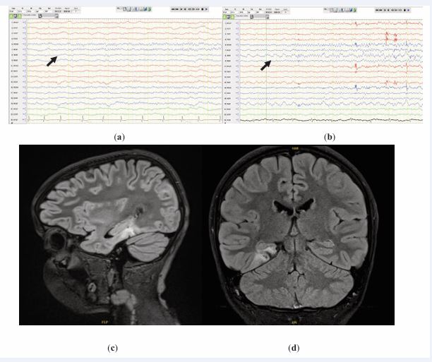 Figure 2 Two distinct clinical seizures are observed arising out of sleep. An 8-Hz alpha wave is observed at F8 at electroencephalography onset, (a) and (b); sagittal and coronal FLAIR MRI scans, (c) and (d).