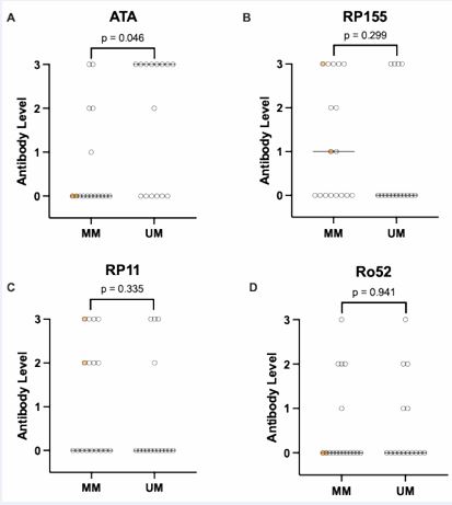 Figure 1 Comparison of serum levels of scleroderma panel antibodies between patients with measurable motility (MM) and unmeasurable motility (UM). A semiquantitative scale was used for the antibody levels, i.e., 0 (negative), 1 (weak positive), 2 (medium positive), and 3 (high positive). Median antibody level is denoted by a horizonal line. The circles highlighted in yellow denote patients with normal motility.