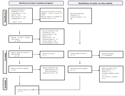 The extensive database search yielded 3,573 publications. Twelve other studies were identified from searching other websites and citations. After removing 804 duplicate records and another 397 records marked as ineligible by automation tools or not retrieved, 2,372 titles and abstracts were reviewed, out of which 1,984 papers were irrelevant, 199 had no abstracts available, 120 were review articles, 16 were books, 10 were book sections/chapters, 19 were conference papers, 02 were generic articles, 01 full text couldn’t be retrieved and were thus excluded. The remaining 21 full texts were reviewed based on inclusion/exclusion criteria. Of these, 17 papers were retained for full text review. Another 15 articles were identified through a reference search of relevant articles and reviews; of these 4 full text articles were found eligible for inclusion. Therefore, a total of twenty-one (N=21) studies met the study eligibility criteria and were included in the final sample. The PRISMA flowchart in Figure 1. provides the details of inclusion and exclusion of studies.
