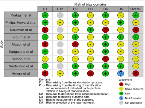 Figure 1 provides assessment of potential biases in multiple Cluster RCTs including in this systematic review. The assessment of bias in the RCTs cluster included in this systematic review revealed varying levels of concern across different domains. Several studies, such as those by Prakash et al., Kilburn et al., and Seidenfeld et al., demonstrated a low risk of bias across most domains, indicating a robust methodological approach. In contrast, studies like Karaman et al. and Amora et al. were identified with a high overall risk of bias, primarily due to concerns in critical areas such as randomization and blinding procedures. Other studies, including Philips-Howard et al., Mason et al., Kangwana et al., and Sampa et al., exhibited some concerns in multiple domains, suggesting potential limitations in study design that may influence the reliability of their findings. Overall, the risk of bias assessment indicates a heterogeneous quality of studies, with a mix of low-risk and high-risk biases (Figure 2).