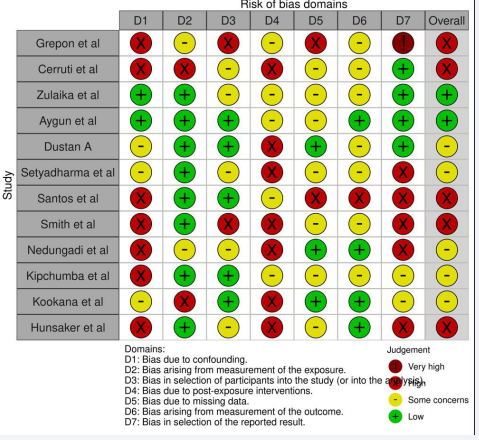 The assessment of bias in the observational studies of exposure included in this systematic review highlights a spectrum of methodological quality across the studies (Figure 2). Several studies, such as Grepon et al., Cerruti et al., Santos et al., Smith et al., and Hunasker et al., were identified as having a high overall risk of bias. These studies exhibited consistent concerns across multiple domains, particularly in randomization (D1), measurement of outcomes (D4), and overall assessment (D7), which may affect the reliability of their findings. Conversely, studies like Zulaika et al., and Aygun et al., demonstrated a low overall risk of bias, with minimal concerns noted in most domains, suggesting a more robust methodological approach. However, a number of studies, including Dustan A., Setyadharma et al., Nedungadi et al., Kipchumba et al., and Kookana et al., were found to have some concerns overall, indicating potential limitations that could introduce bias into their findings (Figure 3).