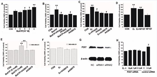 Figure 1 The effects of P2X7R on MCF-7 cells and MDA-MB-231 cells. A) BzATP promoted MCF-7 in a dose-dependent manner. B) P2X7R antagonists blocked the BzATP effect. C) P2X7R antagonists blocked 17β-E2 on MCF-7. D) The excitatory effect of estrogen was not blocked by NF 157. E) BzATP at a high concentration promoted MDA-MB-231, which was blocked by A438079. F) A438079 did not block the estrogen effect on MDA-MB-231. G) Reduced P2X7R expression in MCF-7. H) Silencing P2X7R significantly reduced the estrogen-promoted proliferation. *p < 0.05; **p < 0.01 vs control group; #p < 0.01 vs BzATP or E2 group.