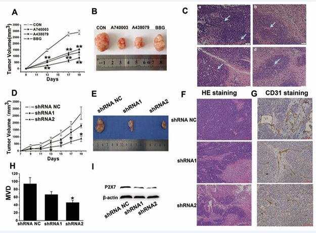 Figure 4 P2X7R blockade or P2X7R silencing on estrogen-related breast cancer tumor growth. A, D) Tumor growth curves after treatment with the P2X7R antagonists or P2X7R-silenced (P2X7R shRNA) MCF-7 cells. **p < 0.01 vs placebo, *p < 0.05 vs shRNA NC. B, E) Representative tumor masses excised at day 19 post inoculum. C, F) H&E staining of tumors treated with P2X7 antagonists or P2X7R shRNA MCF-7 cells. a: placebo; b: A740003; c: A438079; d: BBG. G, H) CD31 and MVD among P2X7R shRNA MCF-7 cells. *p < 0.05 vs shRNA NC. I) Downregulation of P2X7R in MCF-7 cells infected with shRNA.