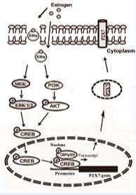 Figure 5 Schematic diagram of estrogen-ERα/ERK or Akt pathway mediated P2X7R expression in MCF-7 cells. Exposure to estrogen induces activation of the MEK1/ERK and PI3K/Akt pathways via ERα, which in turn activate CREB, a nuclear co-transcriptional factor. Activated CREB stimulates the phosphorylation of CBP/p300. This complex then binds to the P2X7R gene and drives its expression, thereby increasing P2X7R protein levels on the cell surface and inducing cell proliferation of MCF-7 cells.