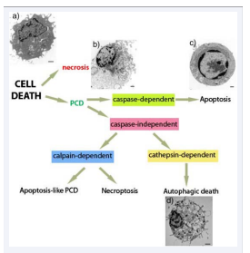 ![Types of cell death and their morphological hallmarks. Diagrammatic classification of different types of cell death. PCD: Programmed Cell Death. Morphological features of a) a healthy cell, b) a necrotic cell, c) an apoptotic cell and d) an autophagic cell. (Electron micrograph pictures adapted from Kroemer et al. [32].](https://www.jscimedcentral.com/public/assets/images/uploads/image-1707482052-1.png )