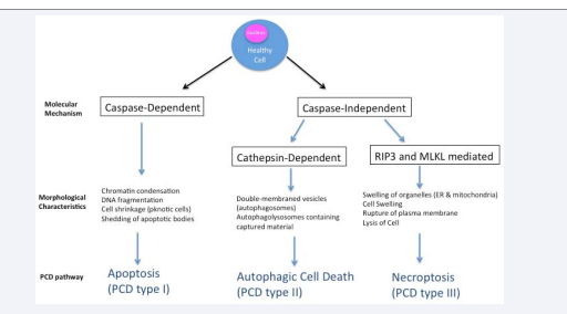 ![Comparison of three types of Programmed Cell (PCD) Pathways. The molecular mechanisms and morphological characteristics of Apoptosis, Autophagic Cell Death and Necroptosis cell death pathways, so-called PCD types I, II and III, respectively, are indicated. Abbreviations: RIP3: Receptor Interacting Protein Kinase 3; MLKL: Mixed Lineage Kinase-like Domain Protein [40].](https://www.jscimedcentral.com/public/assets/images/uploads/image-1707482109-1.png)