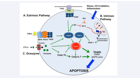 ![Signaling Pathways of Apoptosis. Apoptosis is induced through either the extrinsic pathway (A), intrinsic pathway (B) or the granzyme pathway (C). Activation of initiator caspases 8 and 9 (Casp 8,-Casp9), leads to apoptotic cell death through activation of Caspase 3 (Casp3) and subsequent activation of effector caspases 6 and 7 (Casp 6-Casp7). The extrinsic pathway (A) is initiated via extracellular molecules, FasL and TNF ?, which bind to TNFR family members, Fas and TNFR respectively which activate Casp8 (green lines). The intrinsic pathway (B) is initiated by stress, UV irradiation and inflammation which act on the mitochondria through the pro-apoptotic Bcl-2 family members, such as Bax, resulting in the blockage of the anti-apoptotic activity of Bcl-2 (red lines). As a result, Cytochrome c is released into the cytoplasm and activates Casp9 through APAF-1 (green lines). Casp8 may also trigger the intrinsic pathway through activation of Bid, which inhibits the anti-apoptotic activity of Bcl-2. The granzyme pathway (C) is activated via cytotoxic T cells (CTLs) that introduce granzyme molecules into the target cells via secretion of perforin, which through a multimerization process forms a pore in the cell membrane allowing granzyme into the target cell. Granzymes cleave multiple caspases, including Caspase 10 [45].](https://www.jscimedcentral.com/public/assets/images/uploads/image-1707482206-1.png)