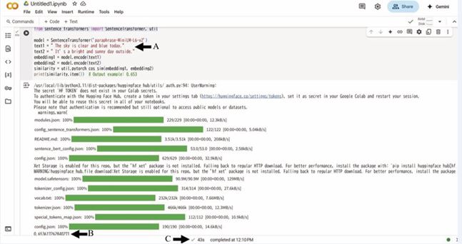This figure illustrates the execution of the Python code in Google Colaboratory. Arrow A indicates where the example sentences (“The sky is clear and blue today” and “It’s a bright and sunny day outside”) both entered as text data without line breaks. Arrow B presents the S-BERT value of 0.653. Arrow C shows that the total processing time was 43 s; however, most of this time was spent on package deployment. Once the package was deployed, the process was completed within a few seconds, even for the longer sentences analyzed in this study.