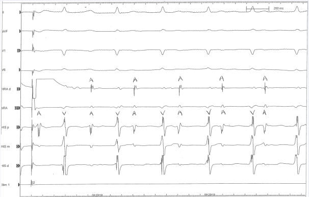 Figure 2: Surface and intracardiac electro grams from the electrophysiology study, which was performed solely with the use of 3D nonfluoroscopic electroanatomic mapping. The intracardiac electro grams show catheters placed in the atrium and near the His bundle which demonstrate an atrial tachycardia at a cycle length of 380 msec.