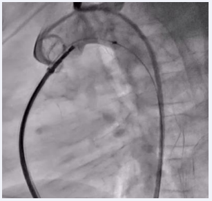 The device was then passed through the defect, and both the aortic and MPA ends of the device were sequentially inflated. A check aortic angiogram showed no residual shunt across the device (Figure 3).
