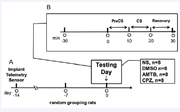 Figure 1: Timeline of experimental procedures across treatment groups. Following a one-week acclimation period, rats underwent telemetric transmitter implantation two weeks before testing. Each group received a designated treatment—normal saline (NS), dimethyl sulfoxide (DMSO), AMTB (TRPM8 antagonist), or capsazepine (CPZ, TRPV1 antagonist)—30 minutes before the cold stress (CS) trial. Data collection encompassed the pre-cold stress (PreCS), CS, and recovery phases.