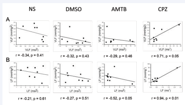 Figure S1: Correlation between spectral power components of blood pressure variability (BPV) and heart rate variability (HRV) during cold stress (CS). (A) Correlation between very low-frequency BPV (VLF, mmHg²) and HRV (VLF, ms²). (B) Correlation between low-frequency BPV (LF, mmHg²) and HRV (LF, ms²) across treatment groups