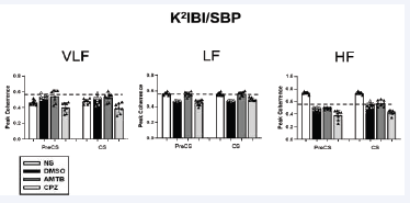 Correlation analysis revealed that CPZ reversed the negative BPV-HRV relationships observed in the NS and DMSO groups (Figure S1). CPZ restored positive correlations between BPV and HRV parameters, suggesting improved baroreflex sensitivity. Furthermore, BPV-HRV coherence was evaluated using peak coherence values (K²IBI/SBP) across frequency bands (Figure S2). In the LF region during both PreCS and CS phases, AMTB exhibited higher coherence than DMSO and CPZ. However, CPZ showed lower coherence values than AMTB, suggesting a reduction in sympathetic dominance and enhanced cardiovascular stability (Figure S2).