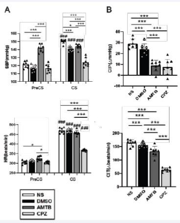 Figure 2: Hemodynamic responses during PreCS and CS across treatment groups. (A) Systolic blood pressure (SBP) and heart rate (HR) changes. Statistical significance is indicated for comparisons between PreCS and CS phases (*p < 0.05, **p < 0.01, ***p < 0.001) and between groups (#p < 0.05, ##p< 0.01, ###p < 0.001). (B) Cold-induced pressor (CIP) and tachycardia (CIT) responses, calculated by comparing PreCS and CS values (*p < 0.05, **p < 0.01,***p < 0.001). CPZ significantly attenuated CIP and CIT during CS (p < 0.001). Data are presented as mean ± SEM. Abbreviation: ?, difference.