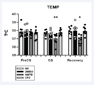 Figure 3: Core temperature (ToC) responses across treatment groups during PreCS and CS. Data are expressed as mean ± SEM, with significant differences indicated by *p < 0.05, **p < 0.01. AMTB administration led to a reduction in ToC.