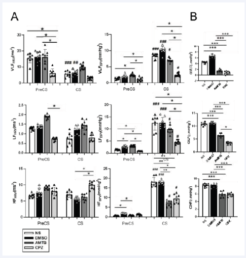To further assess cold-induced BPV changes (CIVLFBPV, CILFBPV, and CIHFBPV), CS and PreCS values were compared across groups. Both AMTB and CPZ significantly reduced these parameters (p < 0.001, Figure 4B), indicating their potential to mitigate cold-induced hemodynamic disturbances.