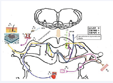 Figure 5: Diagram illustrating TRPM8, TRPV1, and α2-adrenoceptor integration within the somato-sympathetic neuroaxis during cold- and pain-induced cardiovascular modulation. The schematic highlights sensory afferent pathways, second-order neurons, spinal pain and autonomic circuits, and efferent systems. Sensory afferents (blue lines: sympathetic; yellow lines: somatic) are depicted on the left, while efferent motor fibers appear on the right. Sympathetic neurons originating from the rostral ventrolateral medulla (RVLM) and locus coeruleus (LC) project to the spinal intermediolateral column (IML) and dorsal horn pain circuits. The purple line represents IML neurons synapsing onto sympathetic preganglionic neurons, which extend to the heart and vasculature via sympathetic ganglia. The brown line denotes anterior horn motor neurons projecting to skeletal muscles.