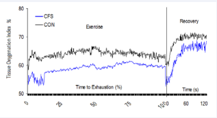 The CFS group had lower oxygen saturation throughout the exercise test (TOI; 58.9 ± 1.8 % vs. 64.0 ± 1.2%; Figure 1).