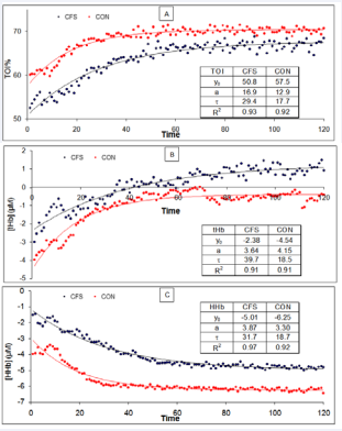 Previous studies have also shown decreases in cerebral HbO2 and HHb changes, suggesting reduced cerebral oxygenation and blood volume with exercise [16,17]. Furthermore, postural change from seated to standing in CFS patients has also shown impaired cerebral haemodynamics [18]. Haemoglobin kinetics can be measured using a time constant of an exponential function used to create regression models, and this time constant (tau, τ) can be thought of as the effect of blood flow kinetics, thereby representing the speed with which a particular system can respond to change [19-22]. Therefore, this measure can provide great insight as to the changes occurring with the haemoglobin kinetics in CFS.