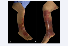 Figure 1: Erythematous-violaceous plaques with blisters and bullae within localised in the right lower leg.