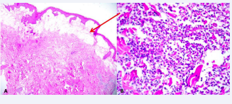 Figure 3: A). Arrow: extensive papillary dermal oedema. B). Dense neutrophilic infiltrate with extensive areas of oedema and leukocytoclasia