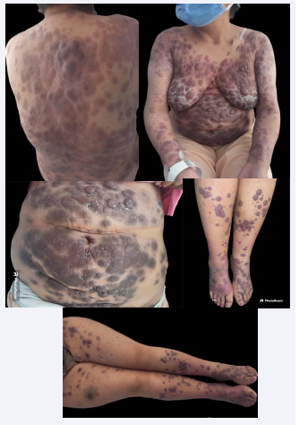 The physical exam portrayed a generalized dermatosis with multiple exophytic, violaceous-green, well-defined, semi-solid nodules affecting the anterior and posterior chest, abdomen, arms. The lower limbs were affected to a lesser extent (Figures 1-3).